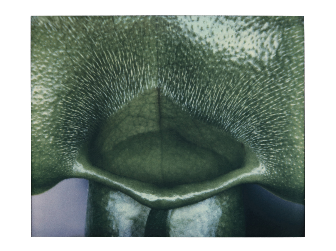Toute ma carrière, j’ai utilisé des Polaroïds, mais ils ne font pas de macro-photographie, c’est l’équivalent d’un 50 mm ou d’un 35 mm. Ici, j’ai utilisé un appareil Polaroïd de dentiste des années 1960-1970 qui permet d’aller très proche du sujet. Cet instrument très basique est équipé de deux flashs. C’est comme si je faisais la radio d’une fleur avec une machine médicale. La lumière permet d’exprimer un sentiment, elle peut être douce, dure, resserrée. Pour ces photos, elle aplatit un peu, comme un constat qui fait aller à l’essentiel de ce qu’on voit et de ce qu’on veut montrer. J’ai essayé avec mon appareil photo classique et mes lumières classiques, mais je ne peux pas arriver à cela. Quand la fleur était près d’une fenêtre je ne mettais pas de flash, quand elle était dans l’obscurité, je mettais les deux flash, pour avoir ce côté chat surpris dans la nuit… Il n’y a pas de concession, la lumière est tel que l’outil me la donnait.